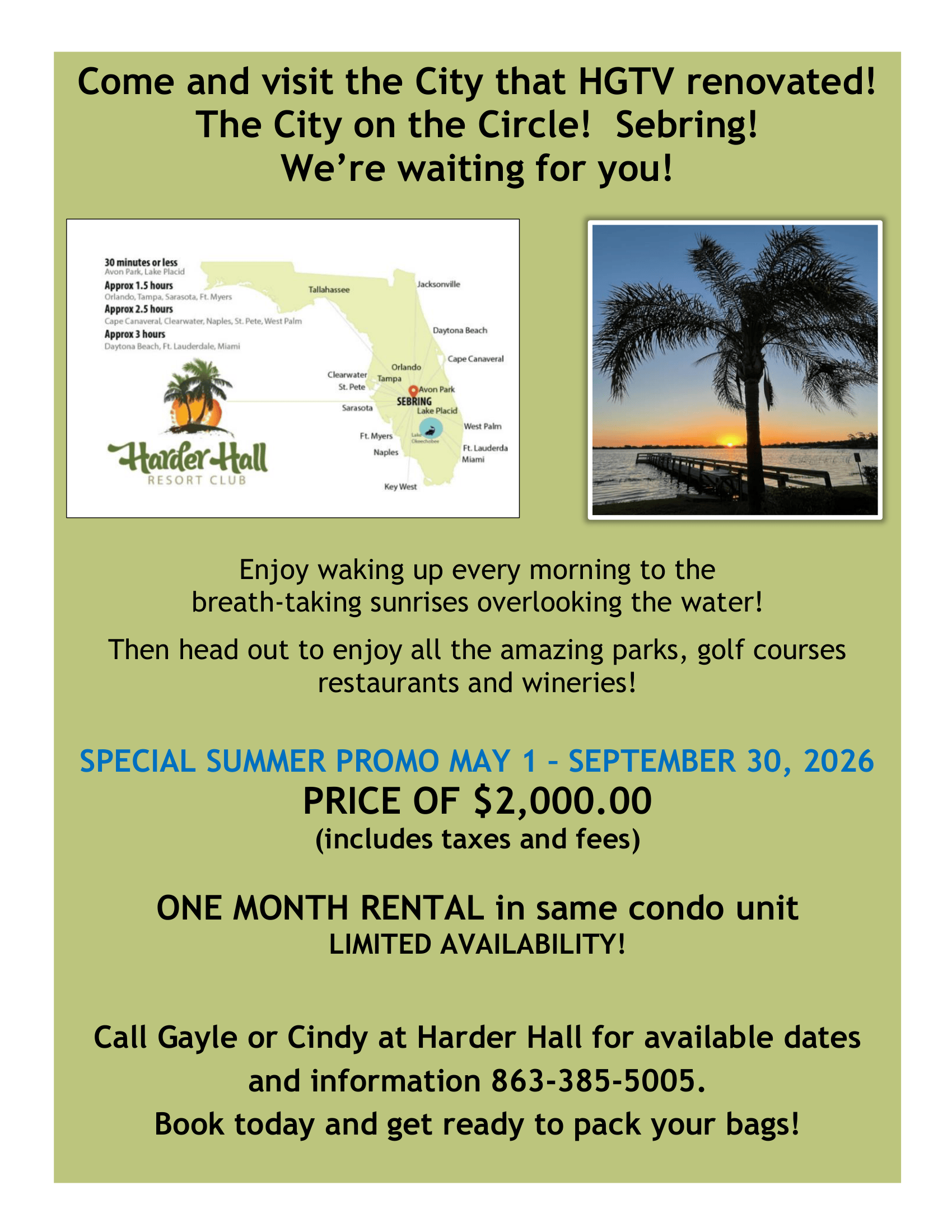 Like us, we know you will quickly fall in love with the quaint and historic “City on the Circle.” You will enjoy the peaceful lakeside setting where you are sure to see many native species of birds and wildlife and a gorgeous sunrise each morning. Our on-site amenities include a large inviting pool (heated during winter months), hot tub, fishing pier, game room, kayaks, bicycles, horseshoes, cornhole, barbeque grills, children’s playground, row boats, paddle boat, computer center, workout room, picnic tables, swings, fishing equipment, recreation center, lending library and WIFI. We are proud to be able to offer all of these amenities to you at no charge.